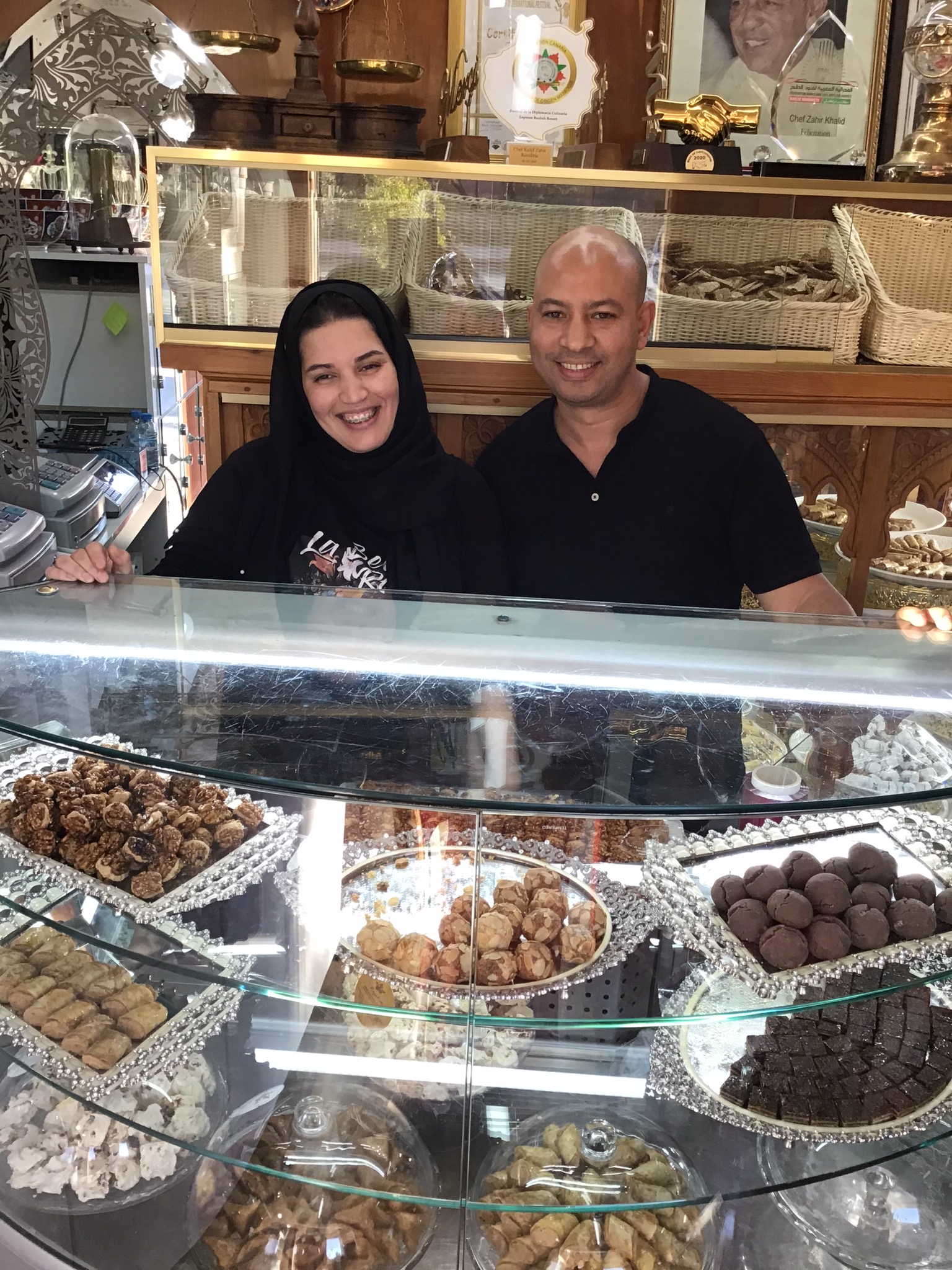 Khalid Zahir y su esposa Siham, en la pastelería ROZALINA de Marrakech, todo un emblema de la repostería alauí.